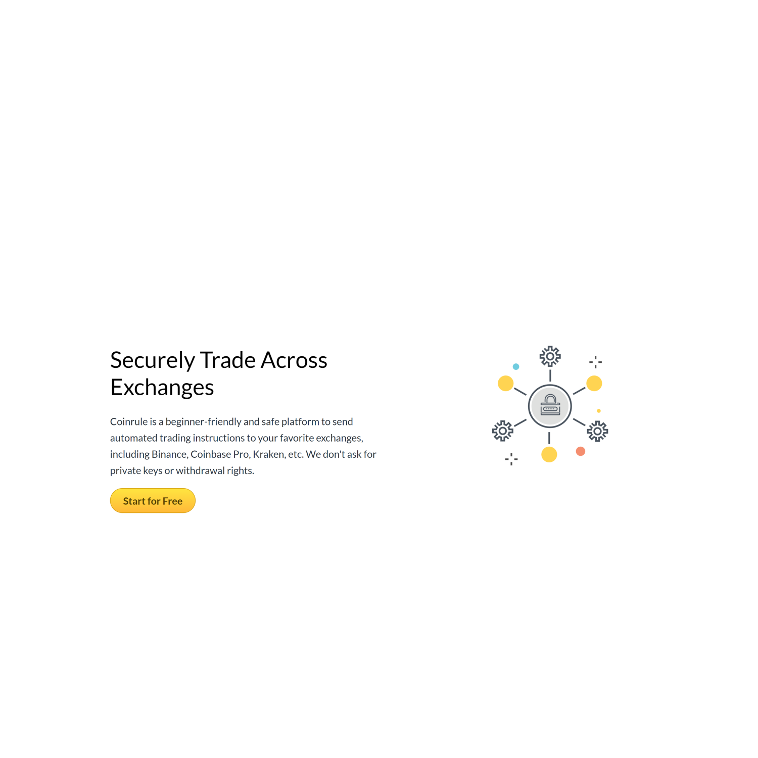 • Coinrule can be used from any supported web browser and connects to over 10 leading cryptocurrency exchanges via API key connections with Binance, BitMEX, Bitstamp, Bittrex, Coinbase Pro, Kraken, and Poloniex all being supported.