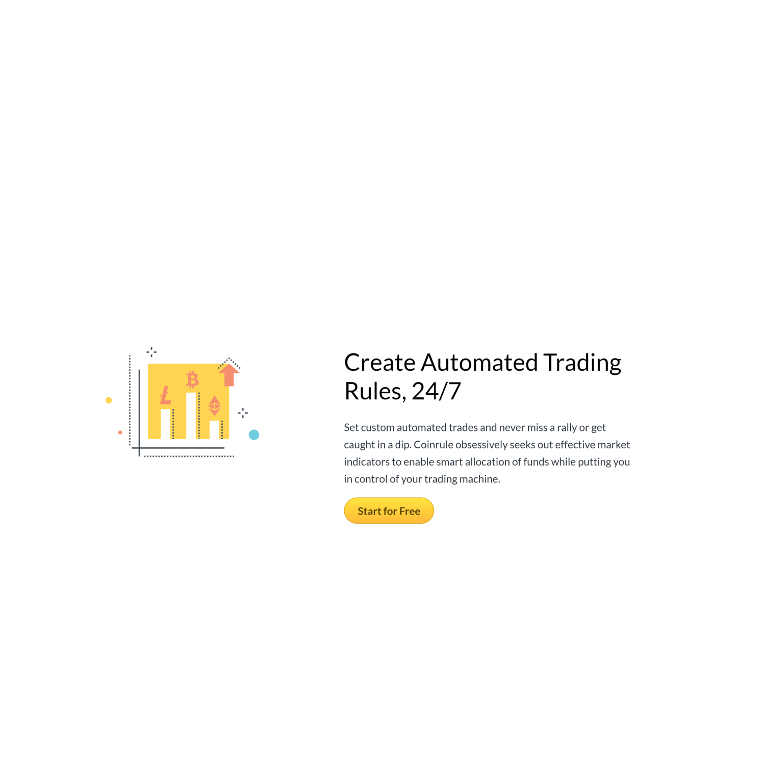 • Coinrule is an easy way to use an automatic trading bot platform for crypto coins that allows you to execute detailed rules of trading with no real-time activity from you.