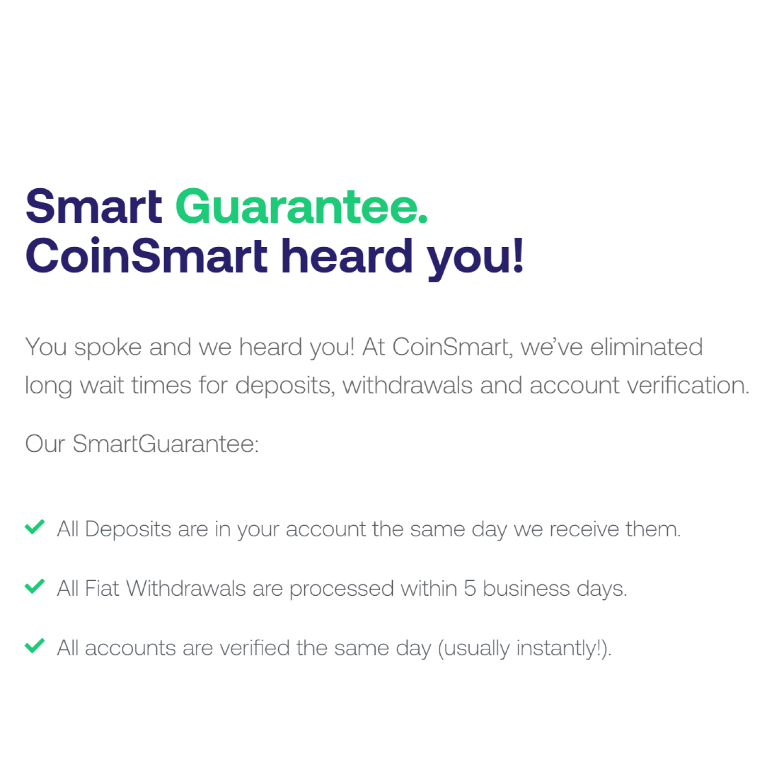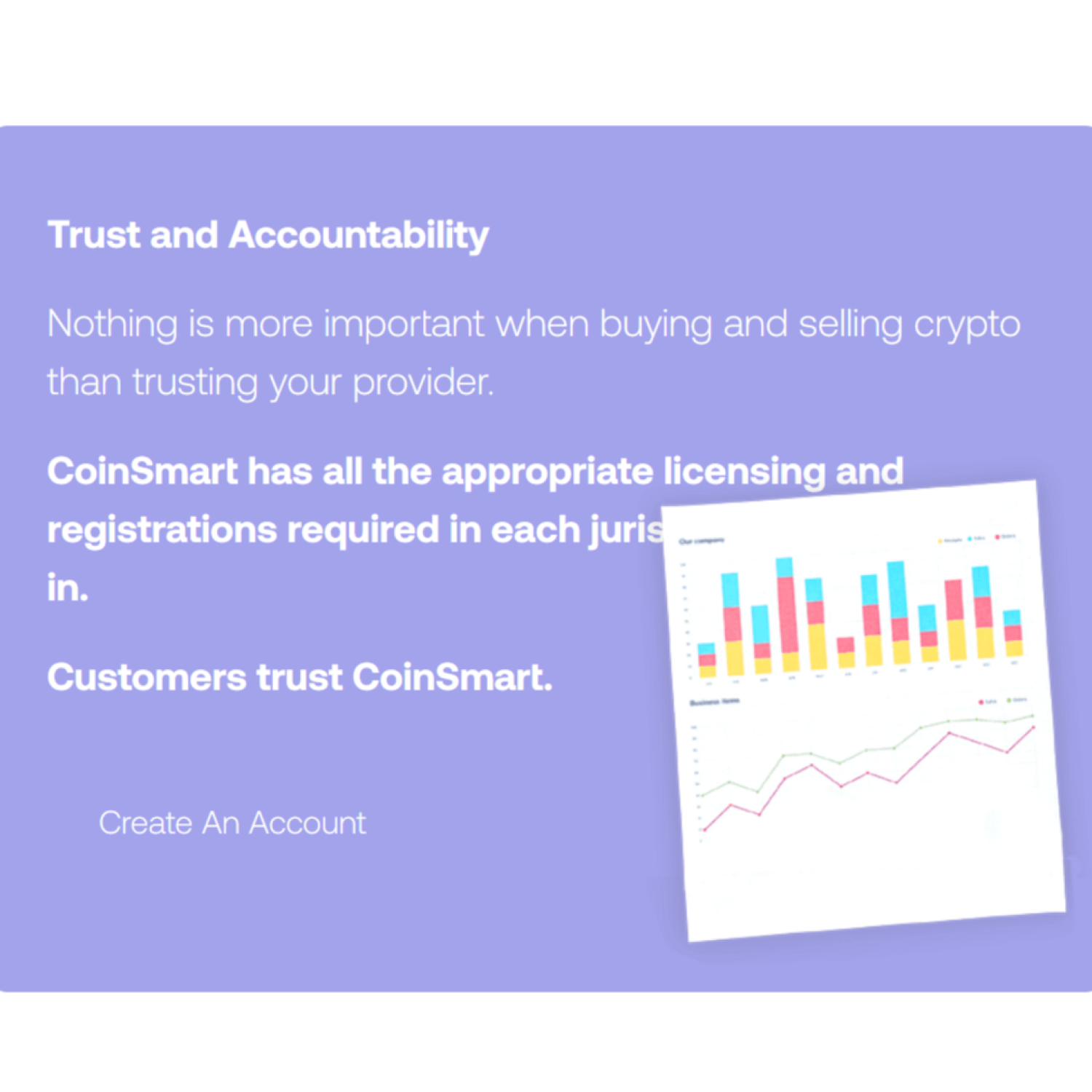 • Offering instant verification, industry-leading cold wallet storage, advanced charting with order book functionality, and over-the-counter premium services, CoinSmart ensures every client's needs are met with the highest level of quality and care.