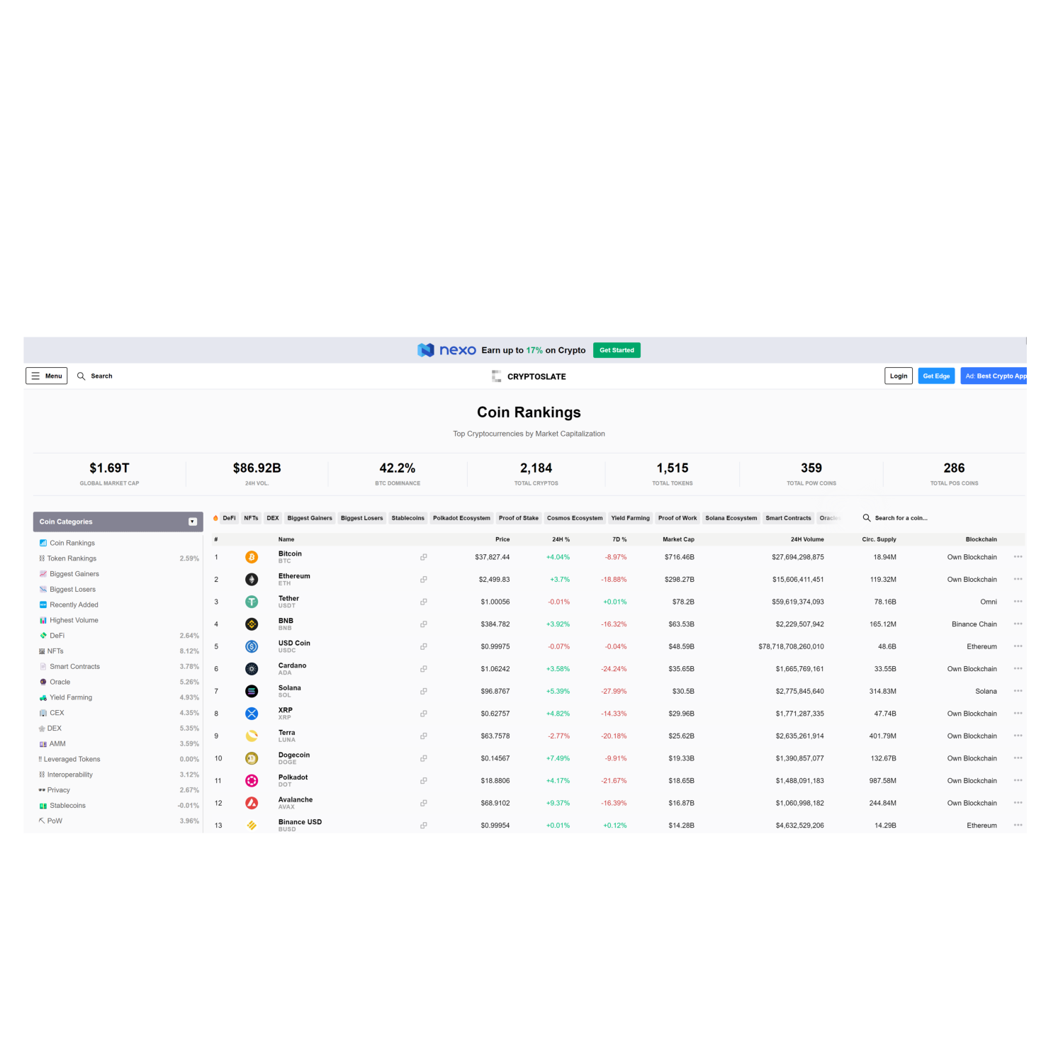 • In addition to providing blockchain industry news and crypto market analysis, CryptoSlate delivers real-time prices and comprehensive data for 2182 cryptocurrencies across 50 industry sectors.