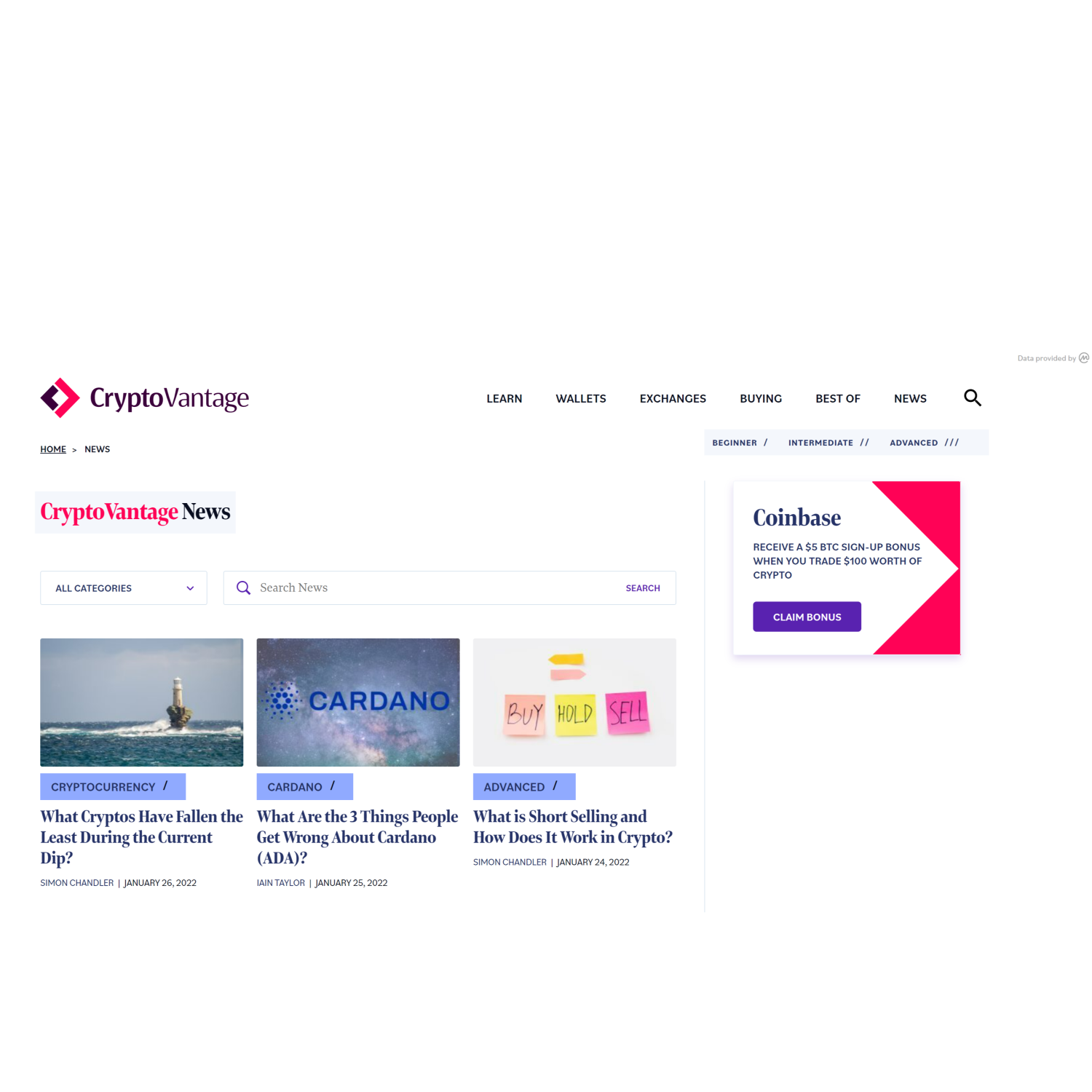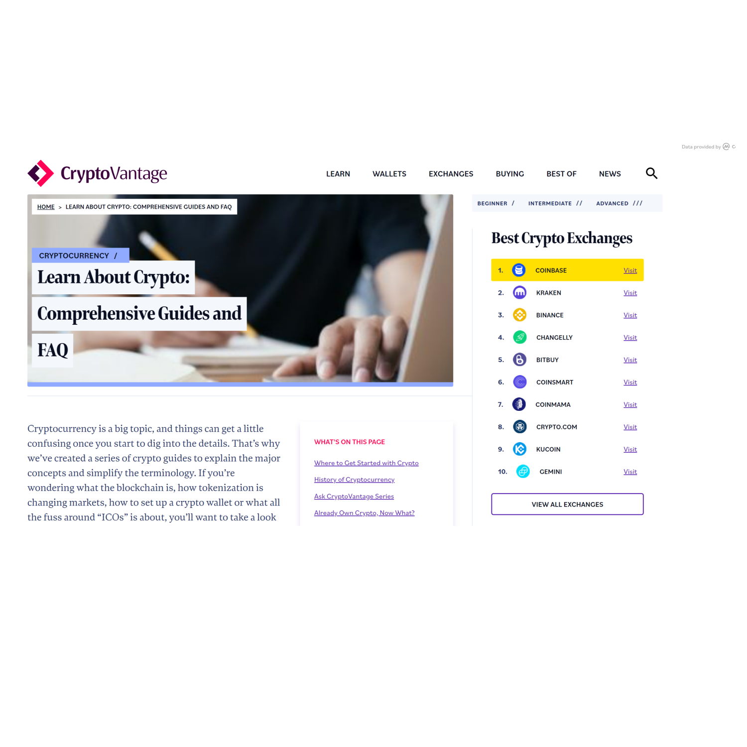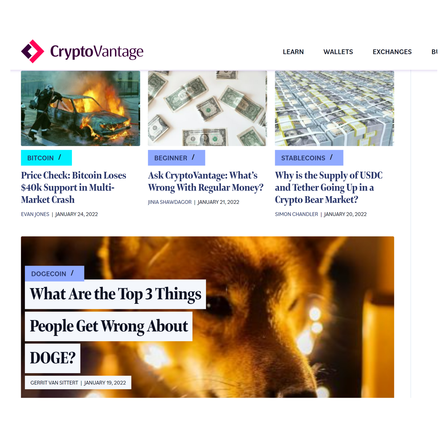 • You’ll find a variety of content on CryptoVantage that's written for crypto users of all experience levels. On the most basic side of things, you’ll find simple guides to setting up your very first cryptocurrency wallet or buying your first Bitcoin.