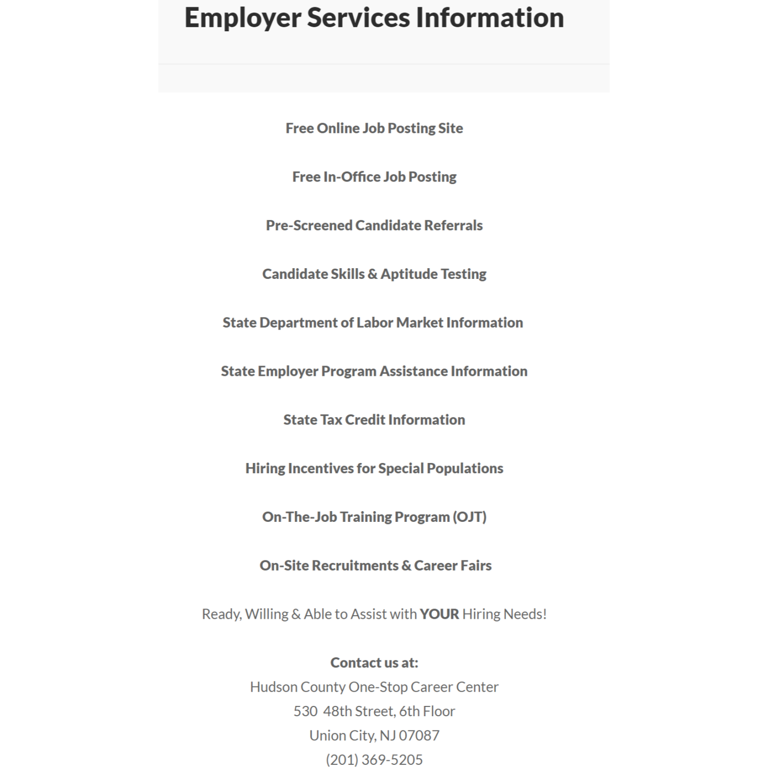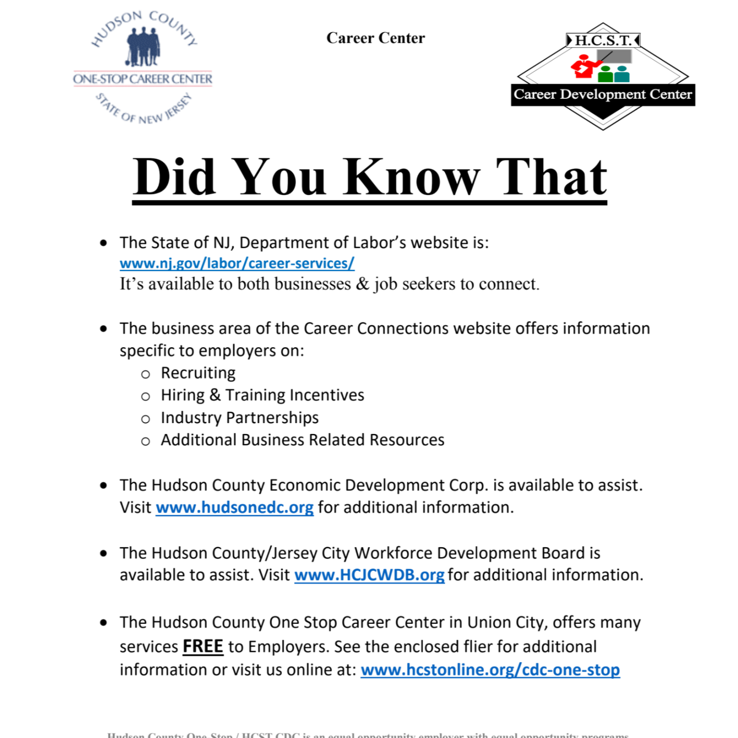 • The Hudson County One-Stop Career Center / (Hudson County School of Technology) HCST-Career Development Center located in Union City, NJ; with satellite offices in Bayonne & East Newark, provides education, job skills training, career planning, and job search assistance to all members of the community.