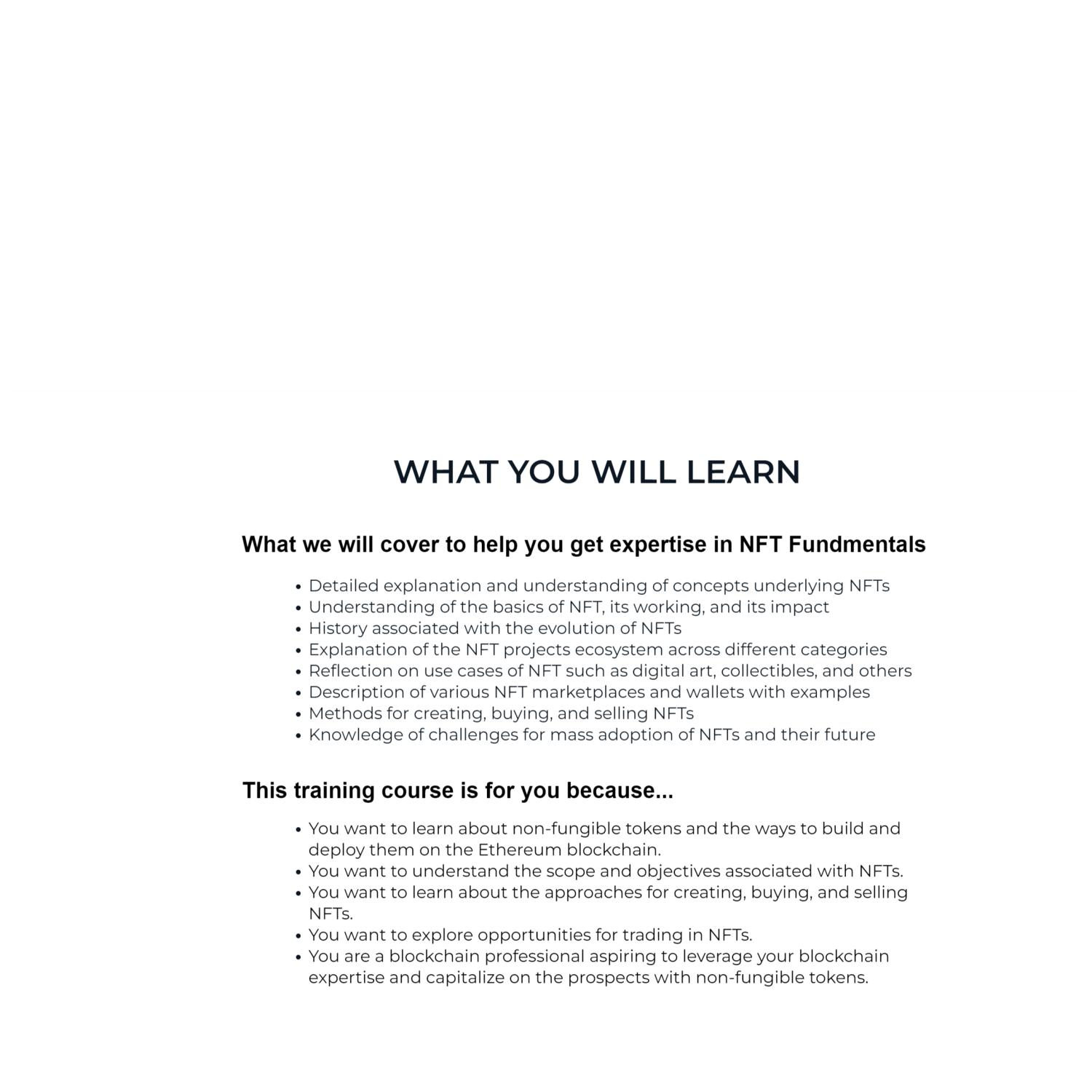 • The NFT course on 101 Blockchains is a fundamental-level course with demo videos, whiteboard videos, and interactive exercises. We have brought the course as a prolific instrument for everyone interested in exploring the potential of asset tokenization. If you want to explore the various functionalities and possibilities with non-fungible tokens, then this course can give you the ideal start.