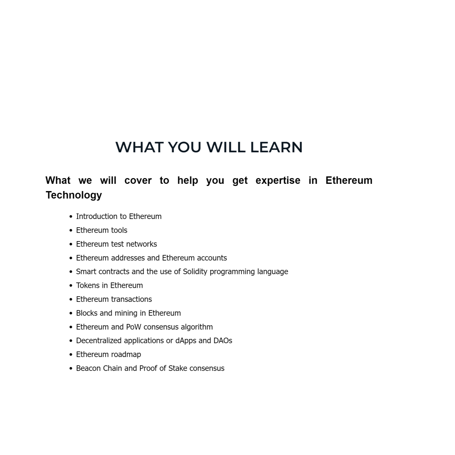 • In addition, you can also learn about the best practices for creating your own tokens. Furthermore, the course goes beyond the Ethereum technology basics and reflects on the next development steps in the Ethereum roadmap. You will find a detailed account of Ethereum technology explained thoroughly with topics such as Ethereum transactions, tokens, Ethereum consensus, and the development of dApps with a specific focus on DAOs.